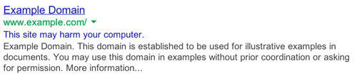 If you suspect a compromise, you should check to see if you’re on the Google blacklist. An easy way to do this is to perform a search for your site and look for the telltale warning in the search results as shown below. Another approach is to use Google Search Console.