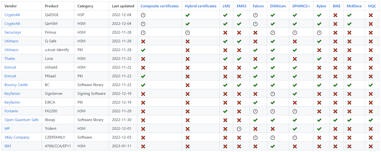 PQC Capabilities Matrix at January 26, 2023 (please check the link for a current version)